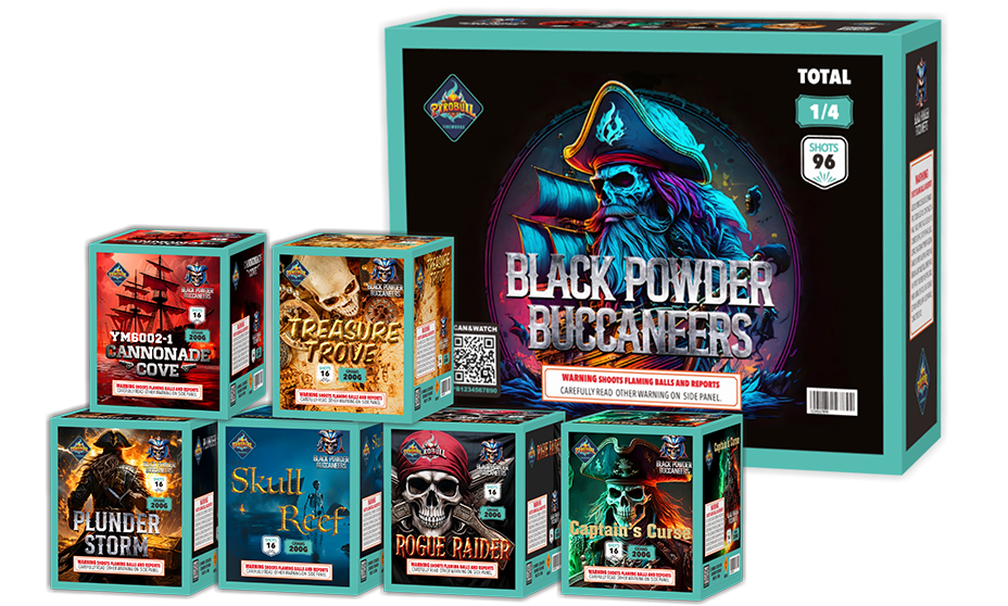 YM6002-1 Cannonade Cove 16 rhythmic bursts: peony crowns with red/white, green/white, blue/white flashes, and glittering red finales. YM6002-2 Rogue Raider 16 rebellious shots: peony crowns with red/green glitter and silver fish comets for a piratical adventure. YM6002-3 Treasure Trove 16 jewel-like bursts: gemstone flowers in red, green, blue, and purple, sparkling like a chest of treasures. YM6002-4 Plunder Storm 16 shimmering shots: morning glory effects in red, blue, purple, and coconut-sparkle combinations. YM6002-5 Skull Reef 16 haunting bursts: alternating red/yellow silver willow tails, evoking ghostly pirate flames over dark waters. YM6002-6 Captain’s Curse 16 golden shots: titanium willow with silver wave cores, cursed with hypnotic swirling patterns.