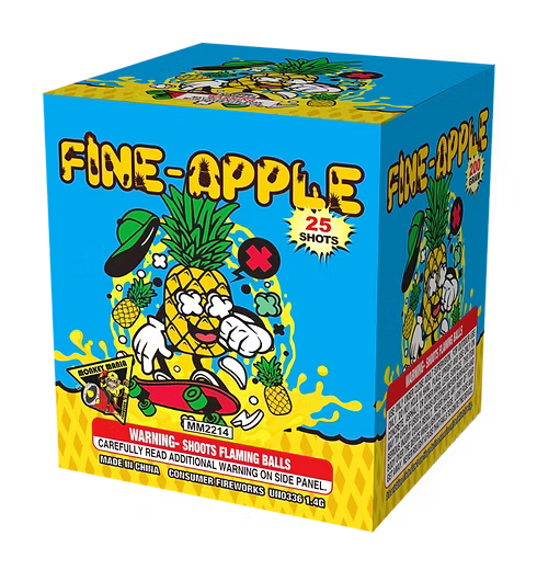 Fine-Apple, featuring yellow tiger tails, purple and silver chrysanthemums, white strobes, brocade effects, and bursts of red, green, and silver chrysanthemums. It’s a fruity explosion of color and light!
