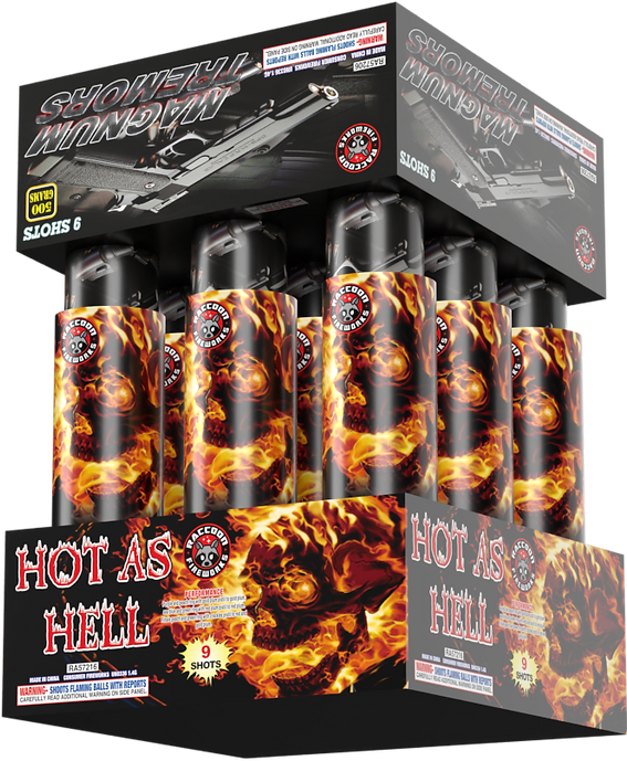 Hot as Hell burning a bright hole into the night sky with sea blue ring, grass green ring with red plum and red plum pistil, purple ring, peach ring with gold plum and gold plum pistil. Magnum Tremors sending tremors into the sky with its amazing horsetails and spectacular rings!