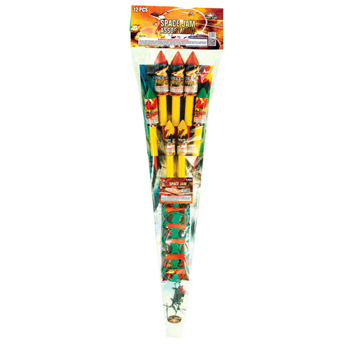 3-piece big rocket set – Red wave with white strobe, green wave with white strobe, brocade crown with white strobe. 2-piece big rocket set – Purple pearls with crackles, green pearls with crackles. 2-piece small rocket set – Blue pearl with silver fish, white strobe with red fish.5-piece aerial spinner set – Spins upward with red/green light.
