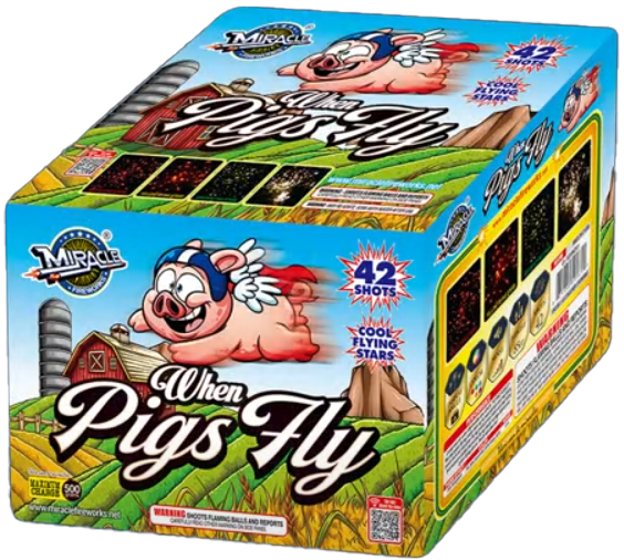 The unique cake on the market with assorted flying stars like flying pigs in the sky! Whistling tail up to red/green/yellow flying stars, crackling tail up to red plum with silver chaos, whistling silver tail up to silver chry. with red and green. Absolutely awesome!